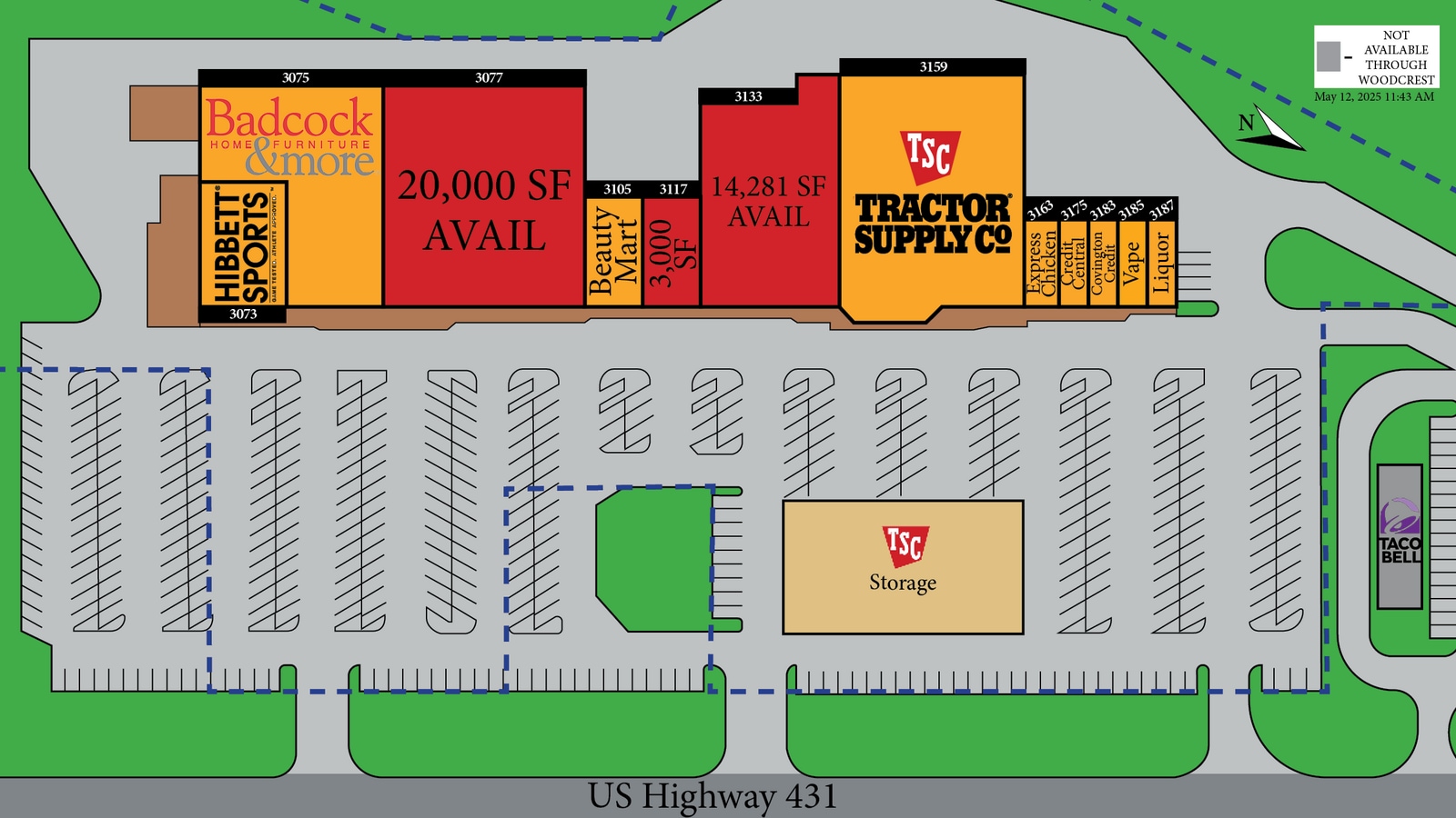 | Total Space Available | 34,281 SF | Frontage | 952’ on US-431 |