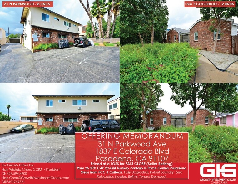 Growth Investment Group California is proud to offer the exclusive listing of 31 N Parkwood and 1837 E Colorado Blvd, a premier 20-unit apartment portfolio located in the heart of Pasadena, CA. Situated just steps from Pasadena City College (PCC) and blocks from the California Institute of Technology (Caltech), this portfolio represents a rare convergence of Turnkey Condition and High Yield Returns (±6.30% Cap Rate) in a high-barrier-to-entry market.