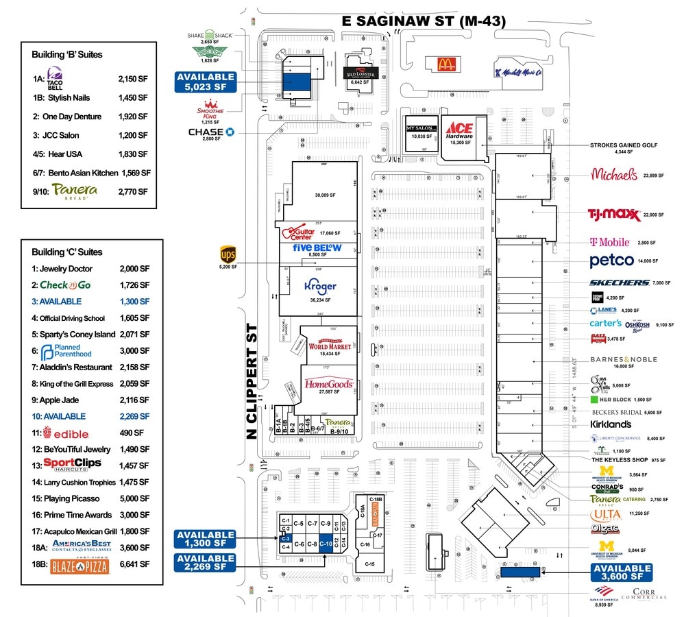 Former Rite Aid now available for lease! Join Shake Shack, Wingstop, and Smoothie King in the remaining 5,023 SF. Located on a premiere hard corner along Saginaw and Clippert streets. Features drive-thru capability, dedicated street signage, and easy entrance from both access streets. High volume road traffic and convenient access to Frandor Shopping Center!