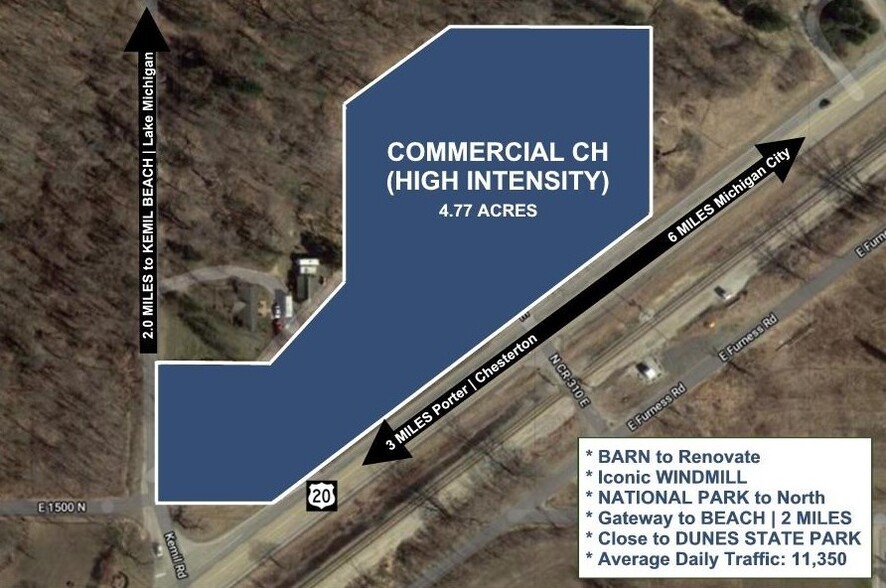 Exceptional commercial development opportunity located at the high-visibility corner of US Highway 20 and Kemil Road in unincorporated Porter County, with a Michigan City address. This 4.78-acre site consists of two parcels and includes a 920 SF barn. With 655 feet of frontage on US Highway 20—traveled by over 13,260 vehicles daily—this location is ideally suited for high-impact retail uses such as large-format furniture, building supply, grocery, appliance, or department stores. Zoned High Intensity, the site is designed to accommodate businesses with significant customer traffic and operational scale. Kemil Road provides direct access to Kemil Beach on Lake Michigan, just 2 miles north, offering a unique gateway for tourism-driven commercial uses. This rare corner property blends visibility, access, and flexibility—perfect for retailers looking to capture both local and visitor traffic in a growing corridor.