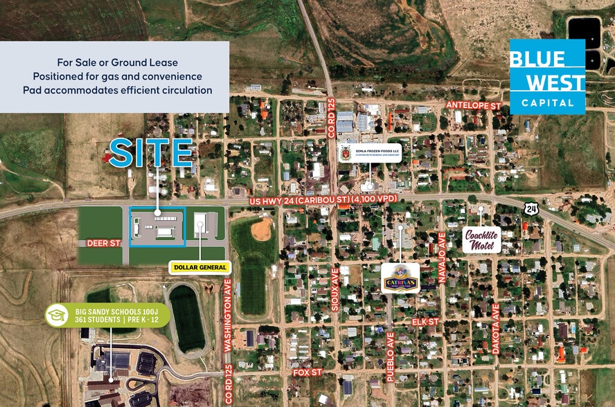 Blue West Capital is pleased to present a 2.10-acre retail pad available for sale or ground lease at the southwest corner of US Highway 24 and Washington Avenue in Simla, CO. The site offers a rare opportunity to serve an undersupplied fuel and convenience corridor, with only one operating gas station across an approximately 55-mile stretch between Falcon and Limon. Positioned to capture highway traffic, the property is well suited for gas, convenience, QSR, or coffee users. Performance metrics from the nearby Loaf & Jug in Calhan, CO serving 408,000+ annual visitors further validate regional fuel demand.