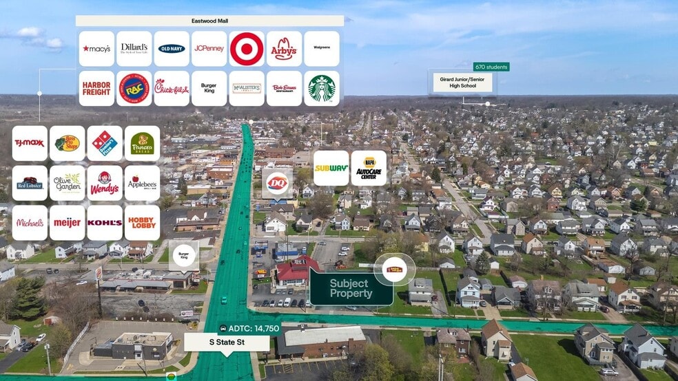 Surmount is pleased to present the exclusive listing for a Hot Dog Shoppe located at 313 South State Street, Girard, OH 44420. The property consists of approximately 4,408 rentable square feet situated on a 1.14-acre parcel and is strategically positioned along South State Street, a primary commercial corridor within the market. The site benefits from strong visibility and accessibility with traffic counts of approximately 14,750 vehicles per day, as well as close proximity to Interstate 80, providing direct connectivity to the greater Youngstown metropolitan area and surrounding regional markets. The asset is secured by a 20-year Triple Net (NNN) lease that commenced April 1, 2021, featuring an annual rent of $270,078 with 1.50% annual increases, offering steady income growth over the lease term.