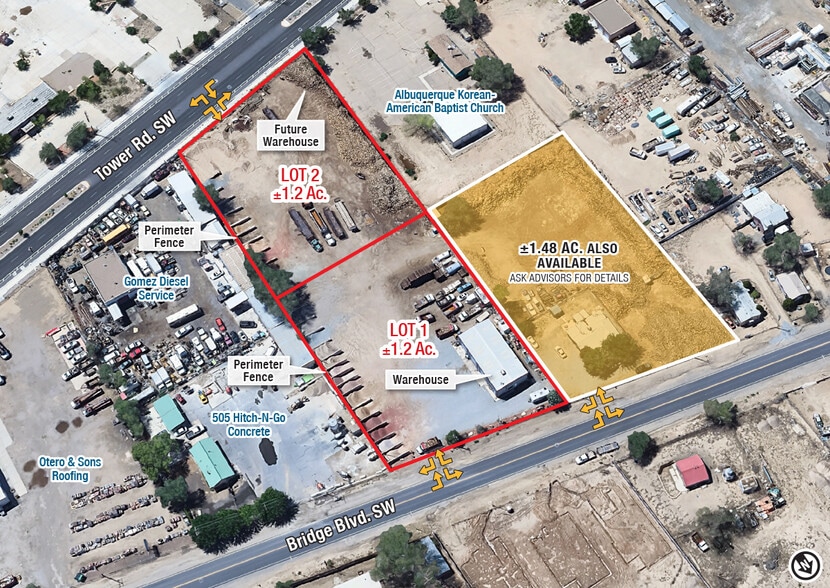 HIGHLIGHTS - Fully-fenced property - Perfect location for contractor, tow yard and truck parking - Adjacent property also available Lot 1: - Building: ±3,200 SF - Land: ±1.2 Acres - Lease Rate: $5,000/Month Warehouse: - 3 - 16’ bay doors - 17.9’ ceiling height - Rest room 2-Story Office Area: - Reception - 3 offices - Break room - Rest room Lot 2: COMING Q1 2026 Building: ±3,200 SF Land: ±1.2 Acres