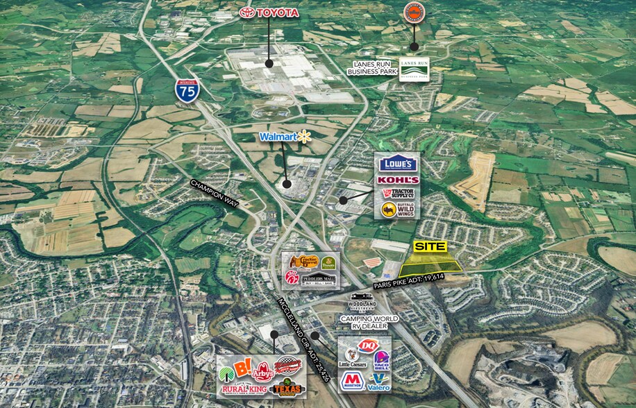 Closest Georgetown Exit to Lexington, KY 0.3 miles from the I-75 interchange, putting this property within a 24-hour drive from 70% of the US population Priced at 2025 appraised value The property is 3.8 miles away from the Toyota Manufacturing Plant