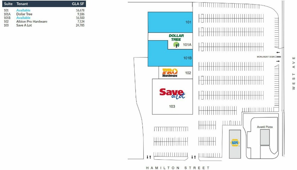 For Sale or Lease Albion Shopping Center has 2 spaces available, 16,678+/- SF and 16,500+/- SF respectively. There are 5 Retail spaces in this shopping center with 2 spaces currently available. Current tenants at the center include Save-A-Lot, Albion Pro Hardware, Dollar Tree and Napa Auto Parts making it a local shopping destination. Situated in a high-traffic location on Route 31, the center offers large open retail spaces in the heart of Central Albion. With road frontage of 492’ on West Ave, ample parking with 787 spaces, a Gross Leasable Area of 74,252+/- SF, total Land Area of 15.4+/- AC, Albion Shopping Center provides an ideal setting for your retail business.