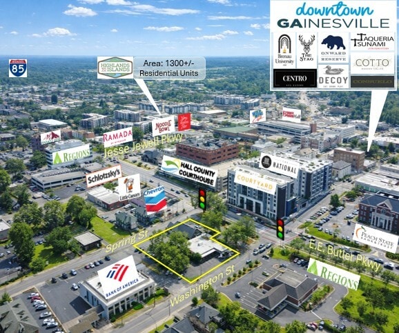 Positioned on a prime corner in the heart of downtown Gainesville, this high-profile location offers exceptional visibility and frontage along EE Butler Parkway—one of the city’s most traveled corridors. The site benefits from steady daily traffic and strong surrounding demographics, anchored by nearby Brenau University and Northeast Georgia Medical Center, creating a built-in customer base of students, professionals, and visitors. Surrounded by established medical, educational, office, and retail users, this premier corner presents a rare opportunity for businesses seeking maximum exposure in Gainesville’s most dynamic and growing districts.