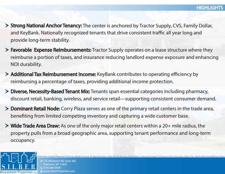 - Strong National Anchor Tenancy: The center is anchored by Tractor Supply, CVS, Family Dollar, and KeyBank and other local tenants