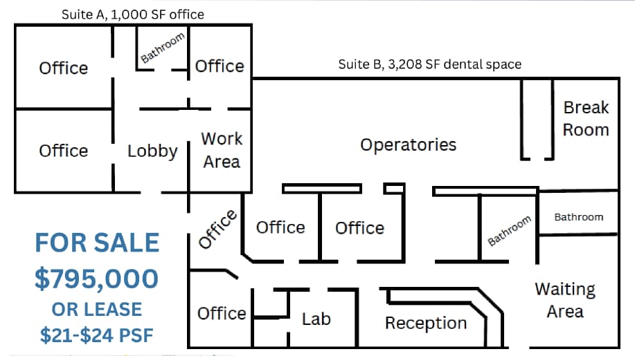 This building on the main road from I25 to Old Downtown Fountain has incredible visibility and versatility. The front 1,000-SF office is rented with two years remaining on the lease. The 2,208-SF rear space has been a busy dental office for nearly 50 years and still has much the infrastructure in place for that use. There is plenty of parking, and great visibility to the new lighted intersection at Indiana and Santa Fe. Don't miss this extraordinary opportunity to own and occupy while collecting rental income from the adjacent space.