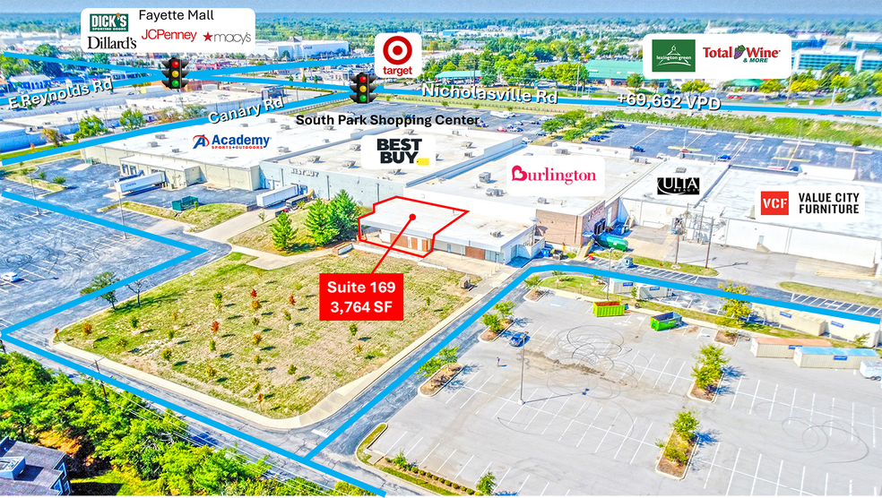 South Park Shopping Center offers a prime retail leasing opportunity in one of Lexington’s most dynamic commercial corridors. Situated at the intersection of Nicholasville Road and New Circle Road, this ±216,235 SF big box center benefits from exceptional visibility and traffic counts exceeding 137,000 vehicles per day. The property is anchored by nationally recognized tenants including Academy Sports, Best Buy, Burlington, Value City Furniture, and Main Event, creating a strong draw for regional shoppers. One space remaining for lease. The center is easily accessed via Canary Road and Loch Ness Drive, with ample rear parking to support customer and employee convenience.