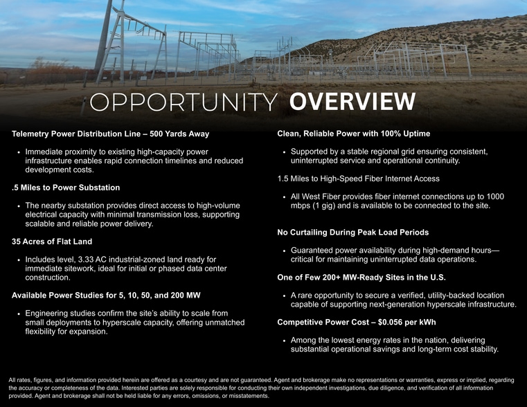 As one of the few 200+ MW-capable sites available in the United States, this property stands out as a premier data center location offering exceptional scalability, affordability, and long-term strategic value in a rapidly expanding AI-driven economy.