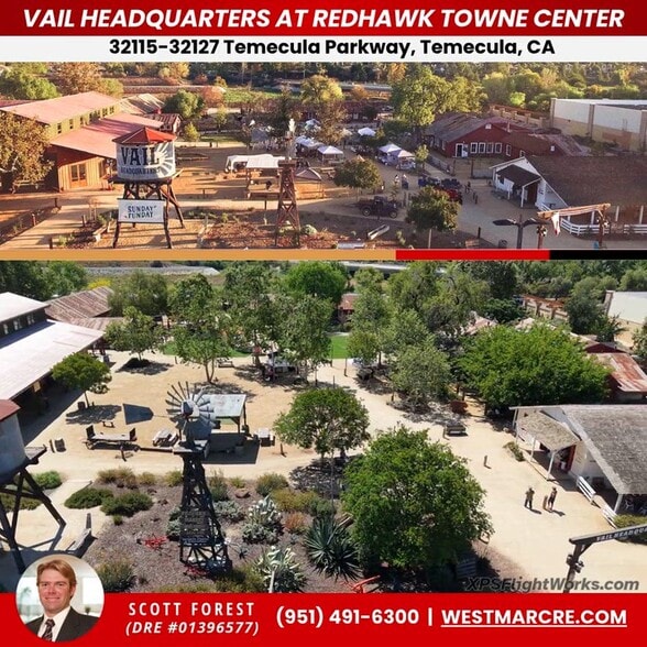 Explore Vail Headquarters - a Unique Redevelopment at Redhawk Towne Center. Discover a unique blend of history and modernity at Vail Headquarters, a prominent destination with monument signage available for your business. This 4-acre historic redevelopment project nestled in a park-like setting is surrounded by major anchor tenants, creating a distinctive atmosphere for your business. Embrace the vibrancy of the community with entertainment and special events, from Sunday Funday to the Farmer's Market, fostering a lively atmosphere that draws ample foot traffic. Conveniently located within walking distance to Temecula Hospital, Vail Headquarters is not just a business location but a hub of connectivity. Situated at the southeast corner of Temecula Parkway & Redhawk Parkway, this redevelopment project offers a prime spot for visibility and accessibility. The 5,000± SF Foodhall features four restaurants and a bar, providing an inviting space for both tenants and visitors. Join the legacy of Vail Headquarters and make your mark in this exceptional historic redevelopment. Price, tenant mix, and availability subject to change without notice.