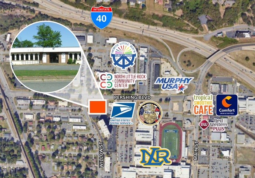 Great corner lot located in North Little Rock Business District close to post office, NLR Police Department, NLR Community Center and much more. Easy access to I-40. Plenty of parking