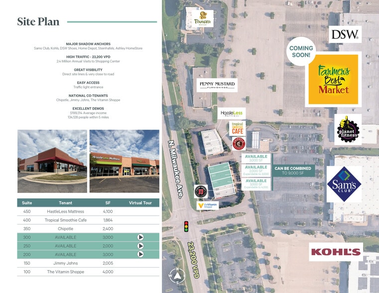 +MAJOR SHADOW ANCHORS -Sams Club, Kohls, DSW Shoes, Home Depot, Steinhafels, Ashley HomeStore +HIGH TRAFFIC -2.4 Million Annual Visits to Shopping Center -23,200 VPD +GREAT VISIBILITY -Direct site lines -Very close to road +EASY ACCESS -Traffic light entrance +NATIONAL CO-TENANTS -Chipotle, Jimmy Johns, The Vitamin Shoppe +EXCELLENT DEMOS -$190,125 Average income -134,251 people within 5 miles