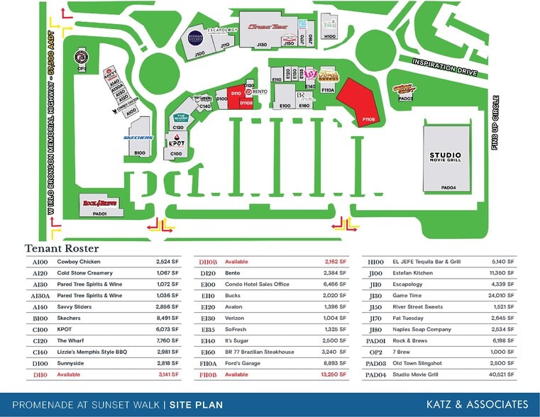 • Located adjacent to the Margaritaville Resort Orlando & Island H20 Water Park, Sunset Walk is a 200,000 SF premier dining and entertainment destination • ±13,250 SF fully built out restaurant/entertainment venue available • From ±2,162 SF - ±5,300 SF retail space available • Sunset Walk is on the 50-yard line of Kissimmee’s tourist district, around the corner from Disney World, and sees over 3M visitors annually • Join: Studio Movie Grill, Fords Garage, Game Time, Sling Shot, and over 15 other food and beverage options