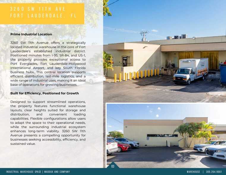 3260 SW 11th Avenue offers a strategically located industrial warehouse in the core of Fort Lauderdale’s established industrial district. Positioned minutes from I-95, SR-84, and US-1, the property provides exceptional access to Port Everglades, Fort Lauderdale–Hollywood International Airport, and key South Florida business hubs. This central location supports efficient distribution, last-mile logistics, and a wide range of industrial uses, making it an ideal base of operations for growing businesses.