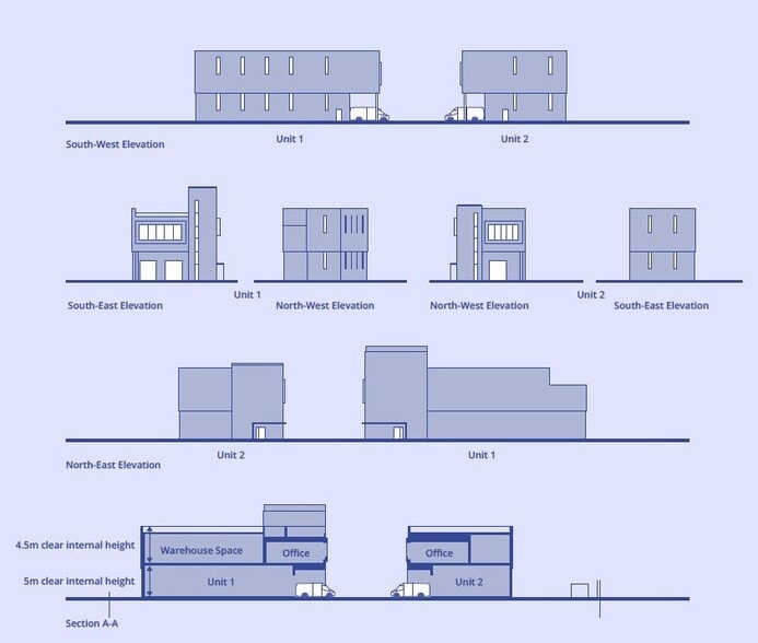 - 4.5-5.5m clear internal eaves height across both ground and first floor.