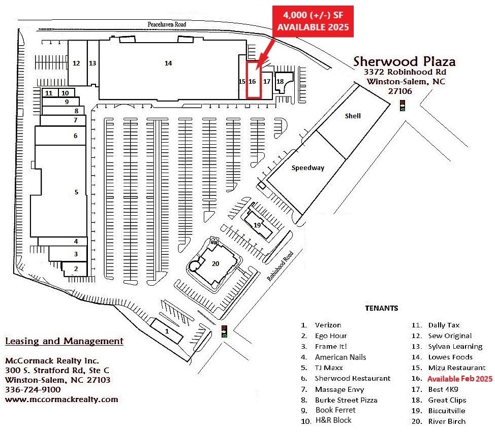 Space available for lease in a busy retail center anchored by Lowe's Foods and TJ Maxx! Located at the corner of Robinhood and Peace Haven Roads, in an area of Winston-Salem with strong demographics & a great traffic count. Dimensions are approximately 40' wide X 100' deep: retail area: 40' wide x 88' deep +/-; storage area: 40' wide x 12' deep +/-. TICAM estimated at $3.14 PSF.