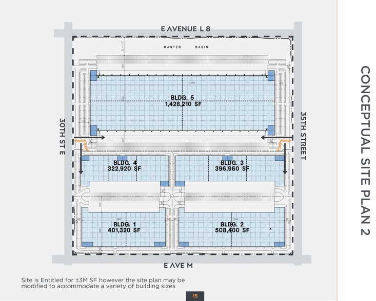The master site plan for Palmdale Logistics Center features two ±1.5M SF cross-dock buildings with 42’ clear heights, abundant auto and trailer parking, and 516 total dock high doors. Three alternative conceptual site plans are included on pages 14-16.