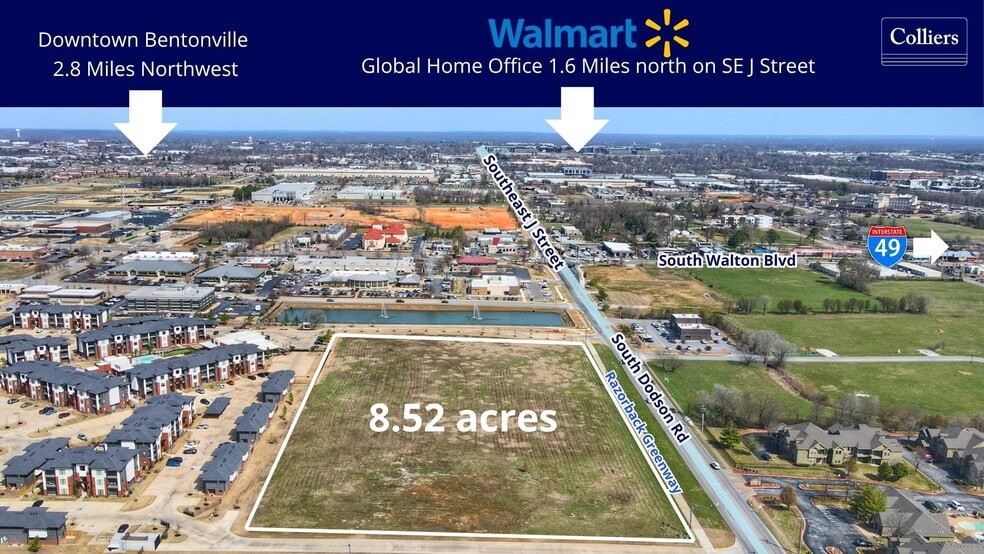Land for sale strategically positioned on the Rogers/Bentonville border along South Dodson Road near I-49. This +/- 8.52-acre development opportunity presents a rare chance to deliver a high-quality residential and mixed-use community — featuring apartments, townhomes, multi-unit homes, and ground-floor commercial — within one of Northwest Arkansas' most rapidly growing and lifestyle-driven corridors, steps from the Razorback Regional Greenway, minutes from Walmart's global home office, and adjacent to the prestigious Pinnacle Hills district.