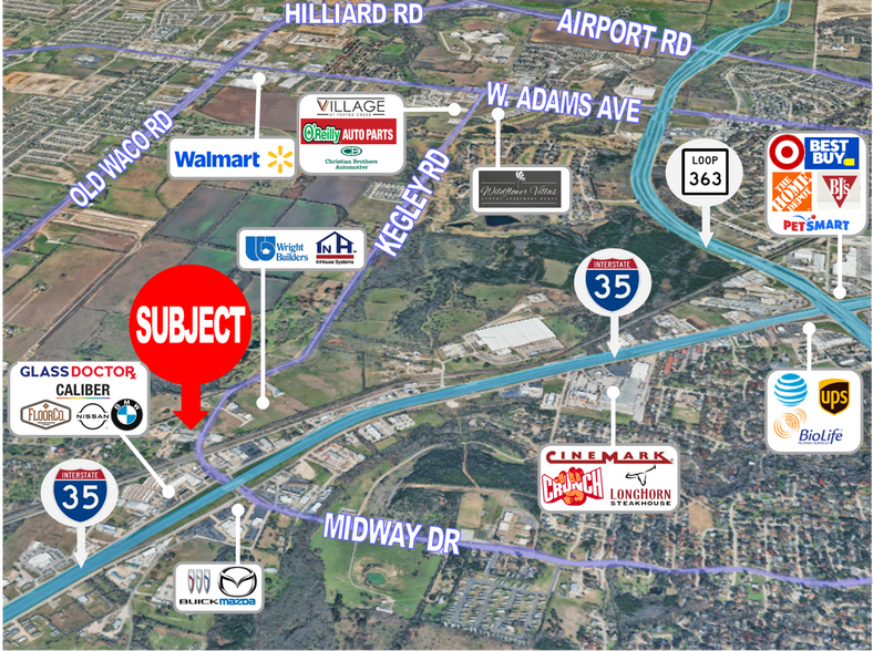 New, professional multi-purpose flex building located along S. Kegley Rd in Temple, Texas. Designed with the intent of creating a landmark. With a focus on accessibility, visibility, and flexibility. Each suite offers an attractive storefront entry with an abundance of natural light, overhead canopy covers at each entry, interior and exterior LED lighting, and 24 hour video surveillance. Kegley Rd provides easy access to IH-35 and W. Adams Avenue (Temple’s western growth corridor). Kegley Rd is currently in Phase III-IV of construction to expand Kegley Rd to a three-lane road. Estimated completion is January 2026.