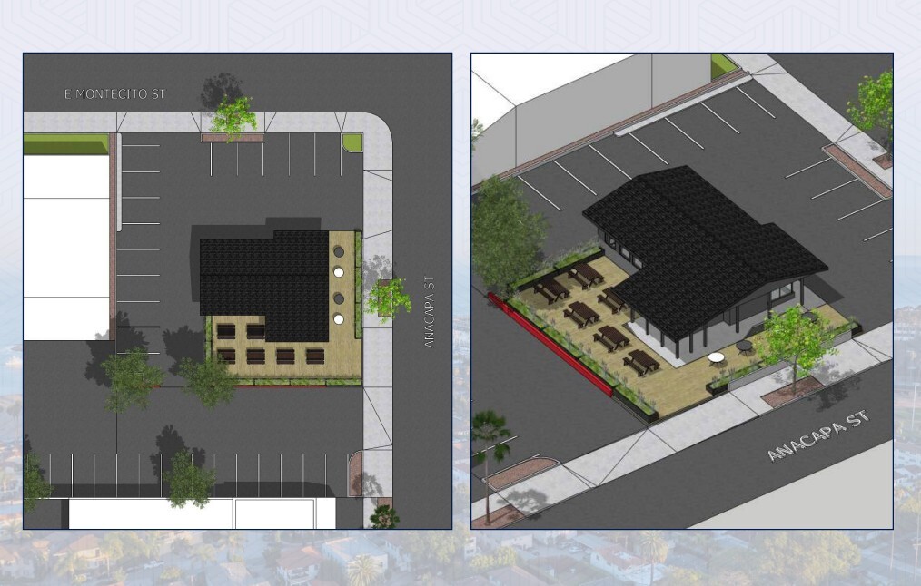 Prime retail, restaurant or coffee location in the funk zone with ample outdoor area and excellent freeway visibility.
