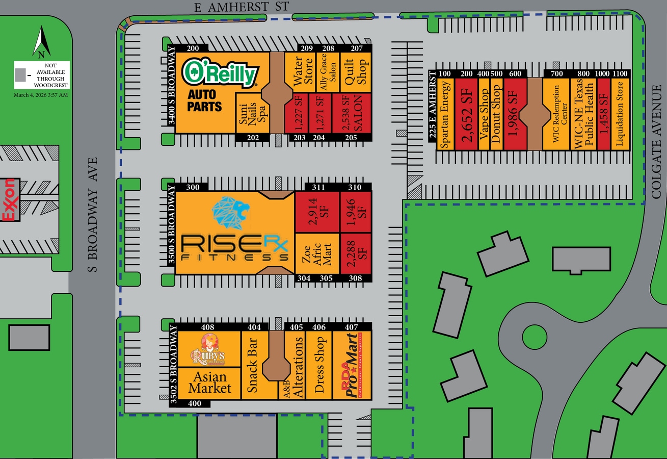 Venture into Tyler, Texas, with the superior retail and office suites at Broadway Town Center, offering highly aggressive lease rates and flexible terms. Welcoming consumers with an inviting façade of stone brick accents and vibrant storefronts, Broadway Town Center has built a robust roster of eclectic tenants, including Rise RX Fitness, O'Reilly Auto Parts, RDA Pro Mart, and more. All availabilities can be delivered in white boxed condition, and some have not been used, allowing tenants to curate a space that perfectly matches their business needs. Explore various well-maintained second-generation opportunities, featuring build-outs that accommodate a salon, offices, or even a café, providing tenants with ready-to-use spaces. Commercial suites at this center are ideal for traditional retail storefronts, restaurants, offices, and medical or other professional service providers. Woodcrest Capital welcomes first-time and franchise businesses to its centers with easy-to-read leases and flexible terms. Woodcrest is also sufficiently sophisticated to please the largest of national credit tenants. As a family-owned business with over 40 years in commercial real estate, Woodcrest owns and operates everything from Class A centers in the busiest neighborhoods to troubled centers it's rehabilitating in struggling rural communities. Positioned about 1.5 hours from Dallas, Tyler has become a veritable oasis for families looking to escape the big-city congestion and a crossroads of industries due to its connectivity to multiple commercial hubs. Downtown Tyler is now brimming with historic landmarks, local restaurants, lush parks, and sprawling suburbs, pushing residential development south towards Broadway Town Center. Since 2020, the population within a three-mile radius has grown at an annual rate of 0.5%, which is expected to improve to 1.7% through 2029. Income demographics are also high, with 69,234 households reporting an average income of $86,200 within a 10-mile radius. A quarter of those make $100,000 or higher, contributing to over $2 billion in annual consumer spending. This has kept Tyler's retail market strong despite external factors, such as the pandemic, as the vacancy rate has remained in line with the 10-year average. With an already booming market and aggressive leasing efforts, Broadway Town Center is the premier shopping center to bloom and thrive in Rose City.