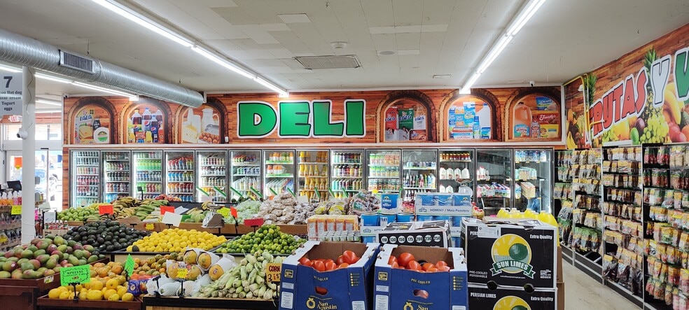Shopping center with a restaurant, pool hall, and Latino grocery store.