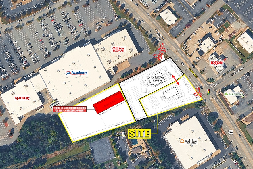 Positioned along Clemson Boulevard, Anderson’s primary retail corridor, this 1.0–2.5-acre site offers a premier ground lease opportunity in a high-traffic location with 33,800 vehicles per day. The property is part of a new 4-acre development anchored by Jim ‘N Nick’s Bar-B-Q and includes a former 10,000 SF automotive building available for lease or redevelopment. With signalized access directly from Clemson Boulevard, the site provides exceptional visibility and convenient ingress/egress for customers. Surrounded by major national retailers such as Home Depot, TJ Maxx, Academy Sports, Lowe’s, and Office Depot, the location benefits from strong co-tenancy and consistent consumer draw. This high-profile retail node features limited barriers to entry, making it an ideal setting for quick-service restaurants, automotive concepts, or other retail users seeking a dominant position in Anderson’s busiest commercial corridor. The property’s strategic location near Interstate 85 ensures regional connectivity, while its proximity to Lake Hartwell and Anderson’s growing population base enhances long-term viability for retail success.