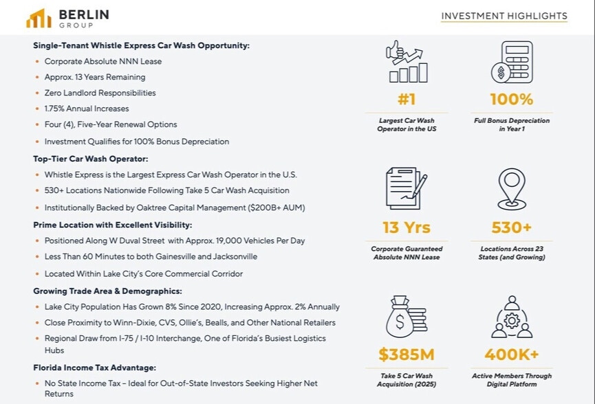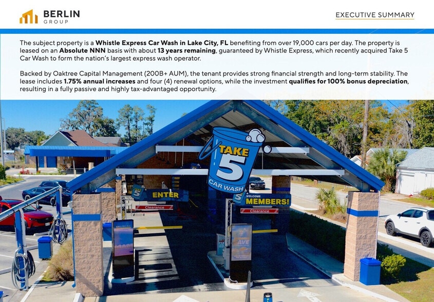 The subject property is a Whistle Express Car Wash in Lake City, FL benefiting from over 19,000 cars per day. The property is leased on an Absolute NNN basis with about 13 years remaining, guaranteed by Whistle Express, which recently acquired Take 5 Car Wash to form the nation’s largest express wash operator.