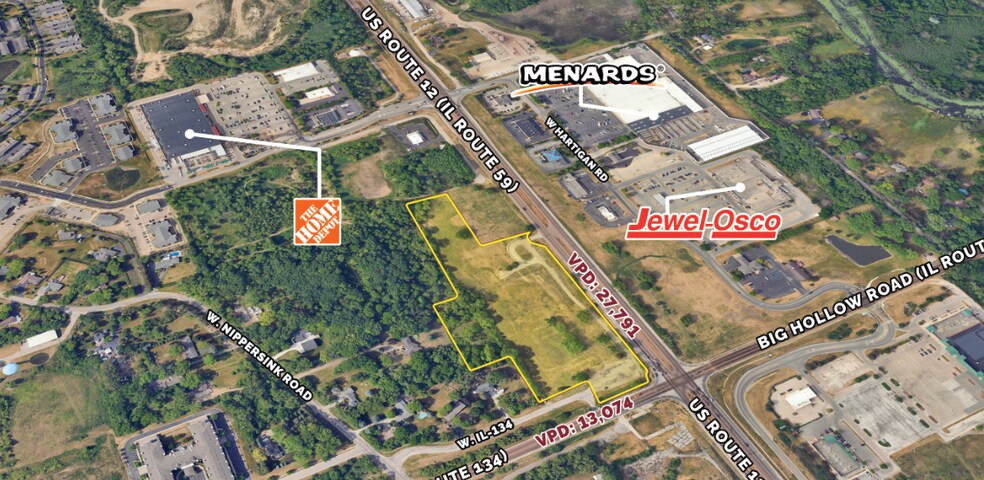 Phenomenal frontage on high traffic US Highway 12 (IL Route 59) at Big Hollow Road (IL Route 134)!! Perfect site for redevelopment, with multiple national brand name retailers already interested in pad sites. Plenty of room for various retail and other uses, after rezoning, which the Village of Fox Lake has stated they are very open to, and eager to get retail and ancillary uses developed on the site. Full access median-cut mid-site on Highway 12, and a curb cut on Big Hollow Road, plus back access via an access road to the East. Surrounded by major brand names, and customers ready to shop! Over 300 new residences planned within 2 blocks, and starting construction soon.