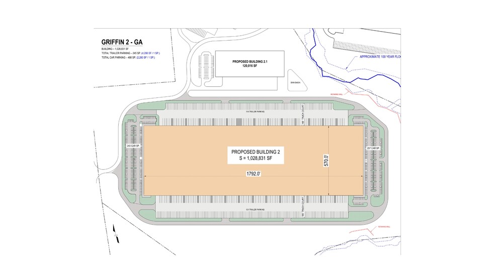 Structural Frame: robust reinforced concrete Slab: 8" reinforced slab 4000 psi Clear Height:40' Column Spacing: 50'x 56' with 60' speed bay Dimensions: 570' deep × 1792' wide Truck Court: 185' with concrete apron Drive-in Doors: 4 Dock Doors: 194 Trailer Parking: 245 Car Parking: 480