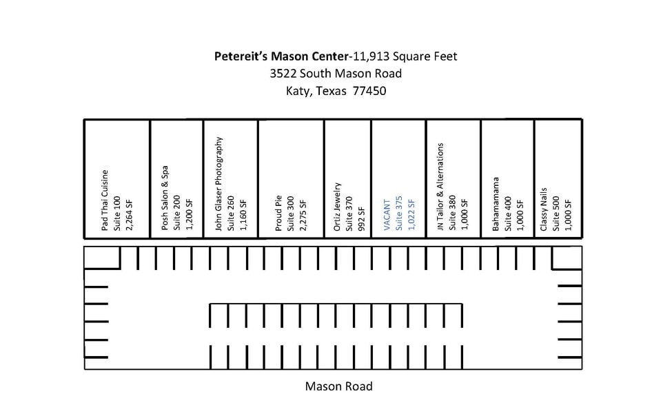 Mason Center was built in 2003. The strip center is surrounded by new real estate development. It attracts a high volume of customers due to a well-established tenant mix. The property has beautiful landscaping and is a Class A building. Petereit's Mason Center is located at the busy intersection of South Mason Rd & Westheimer Parkway.