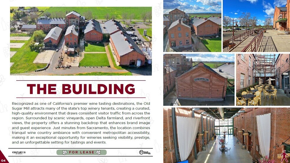 Recognized as one of California’s premier wine tasting destinations, the Old Sugar Mill attracts many of the state’s top winery tenants, creating a curated, high-quality environment that draws consistent visitor traffic from across the region. Surrounded by scenic vineyards, open Delta farmland, and riverfront views, the property offers a stunning backdrop that enhances brand image and guest experience. Just minutes from Sacramento, the location combines tranquil wine country ambiance with convenient metropolitan accessibility, making it an exceptional opportunity for wineries seeking visibility, prestige, and an unforgettable setting for tastings and events.
