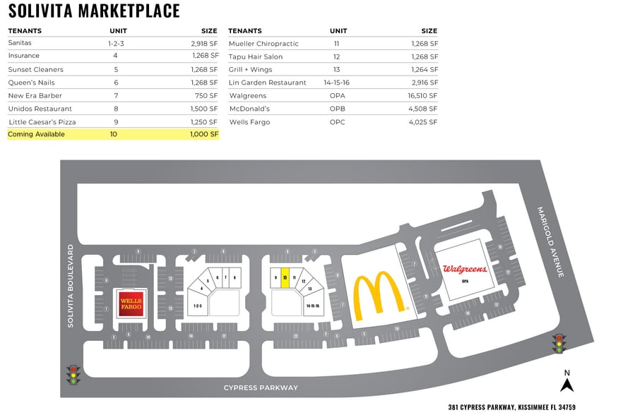 • 38,473 SF High Profile Shop Space at the NEC of Cypress Pkwy & Marigold Ave • 1,000 SF coming available • Excellent visibility from Cypress Pkwy • Signalized access on Cypress Pkwy and access from Marigold Ave • Strategically located directly in front of Poinciana Lakes Plaza and adjacent to HCA Florida Poinciana Hospital • Co-tenants include Walgreens, McDonald’s, Wells Fargo, Little Caesars • Cross access with Poinciana Lakes Plaza power center with co-tenants that include Sprouts, Crunch Fitness, TJ Maxx, Ross, Burlington, ULTA, Five Below, Rack Room and Petco • 44,500 VPD on Cypress Pkwy & 5,700 on Marigold Ave