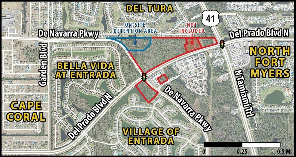 Lot 1 41.03 Acres. Located on Hard corner with lighted intersection of Del Prado Blvd N. & De Navarra Pkwy.
