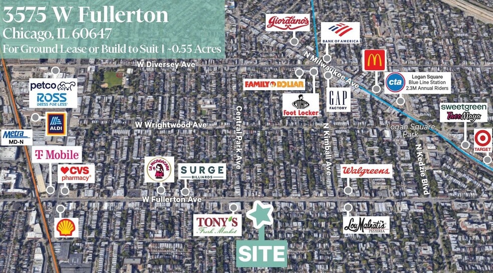 + 0.55 Acres of Land Available for Ground Lease or Build to Suit + Rarely Available Land Site at Hard Signalized Corner in Logan Square + Direct Frontage to Fullerton Ave - 22,700 VPD + Surrounded by Rooftops - Over 500,000 People within 3 Miles + Walking Distance to Dynamic Milwaukee Ave Retail Corridor + Directly Across the Street from Tony’s Fresh Market