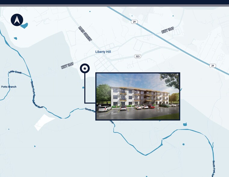 built-in barbecue grills. The site is within a five-minute walk to Downtown Liberty Hill, a historic district undergoing revitalization with upcoming