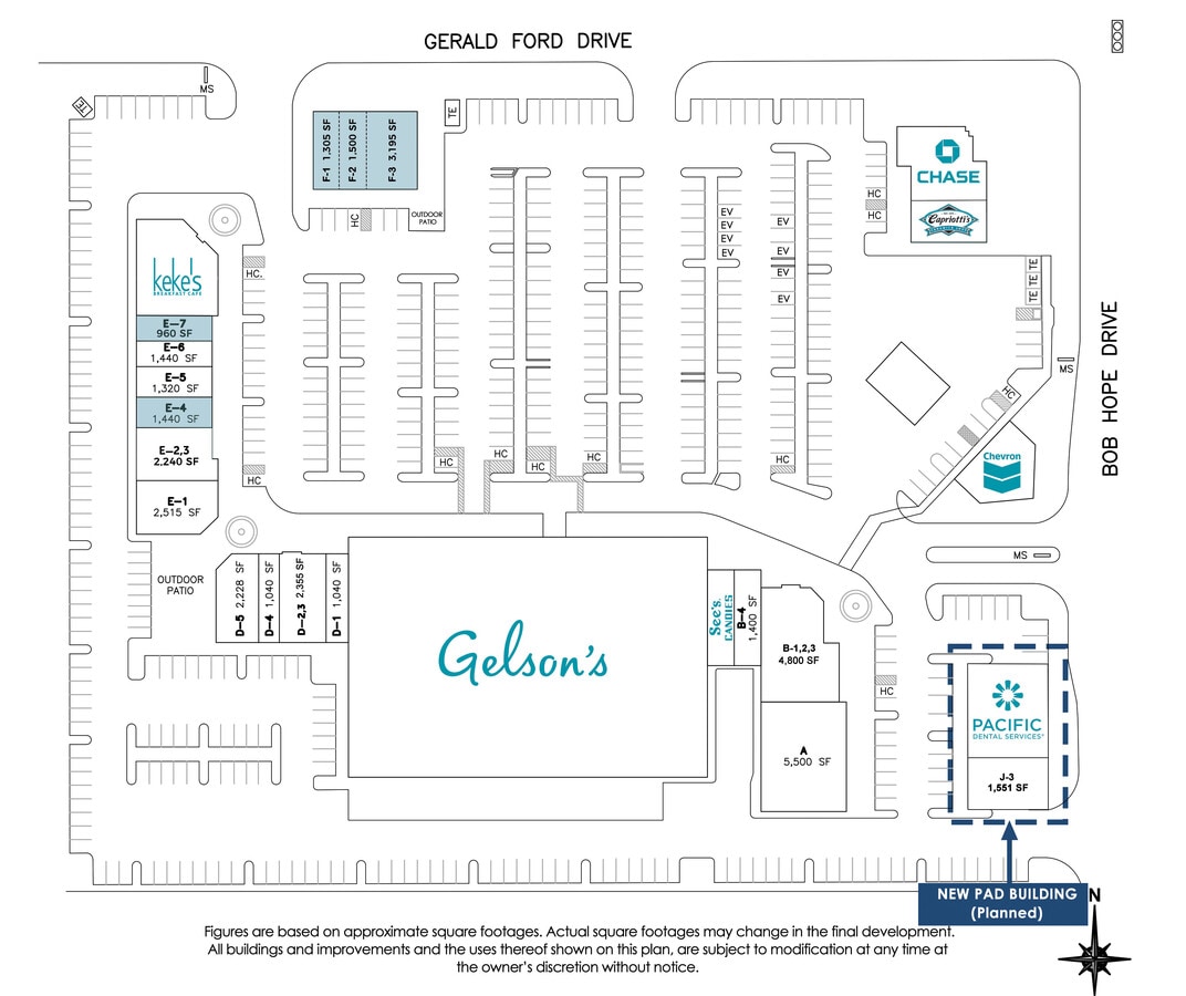 Rancho Mirage Marketplace, located at 36101 Bob Hope Drive, is a ±98,500 square-foot neighborhood shopping center with a premier address in Rancho Mirage, California. Anchored by Gelson’s Market, the Marketplace is also home to Chase Bank, See's Candies, Chevron, and a variety of dining, retail, and personal services options. Businesses in the center enjoy exposure to a combined ±38,000 average daily vehicles at the signalized intersection of Gerald Ford Drive and Bob Hope Drive. The center is located adjacent to the development of Disney’s Storyliving Community, Cotino™ —618 acres that will include the addition of residential, hospitality, commercial, and office elements. Rancho Mirage Marketplace’s strategic address offers access to a robust potential consumer base, with over 50,000 residents and more than 25,000 daytime employees within a three-mile radius. There are approximately 3,000 hotel rooms within a three-mile radius, five of the largest employers in Rancho Mirage are within two miles, and the Eisenhower Medical Center, named one of the top 100 hospitals in the United States with over 3,000 employees, sits just one and a half miles away. Additionally, the new Del Webb active adult community consisting of more than 1,000 homes is just one and a half miles away. Given the strong surrounding demographics and the desirable grocery store anchor, Rancho Mirage Marketplace presents an attractive opportunity for retailers of all kinds.