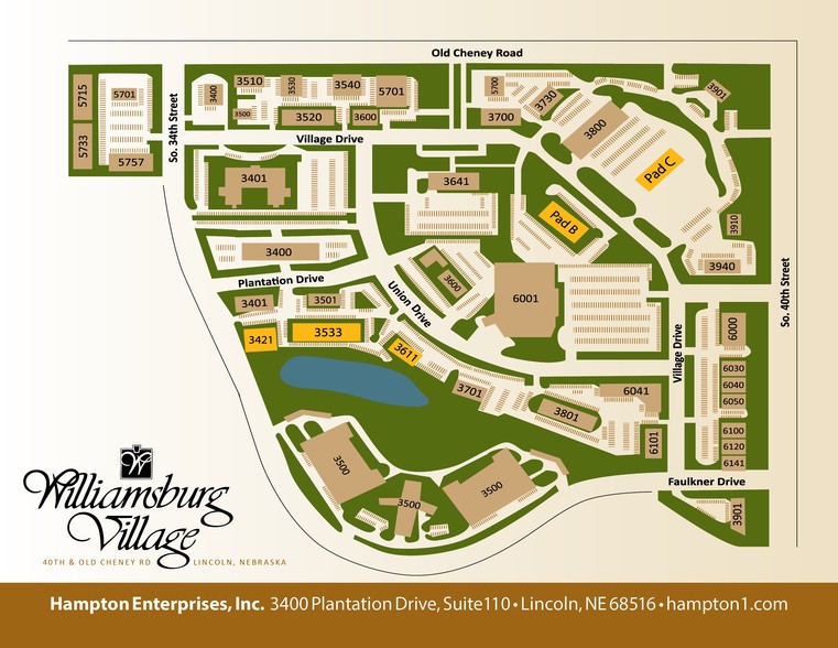 Williamsburg Village is a neighborhood development located in a high traffic area of Lincoln, Nebraska. Office, medical, and retail development park. Located in Williamsburg Village on 34th & Old Cheney.