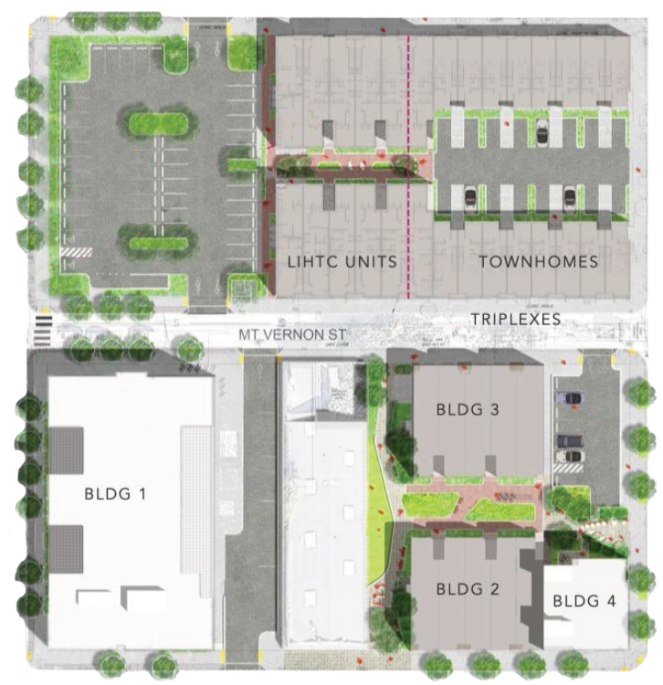 - 166 residential units consisting of 112 market rate apartments, 32 affordable apartments, 16 townhomes and 2 triplexes