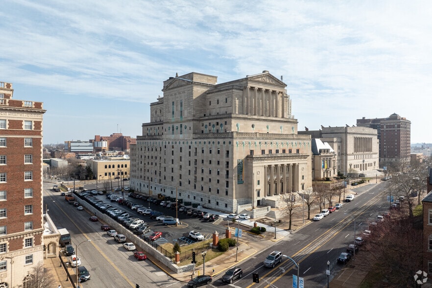 The iconic New Masonic Temple building, offering stunning skyline views. This prime location is next to Saint Louis University and just minutes from downtown. The original, grand main lobby spans two levels and features massive bronze doors, black and white marble flooring, coffered ceilings, and chandeliers. A striking 38-foot mural titled 'The Origins of Freemasonry,' created in 1941 by African American artist Jessie Housley Holliman and dedicated by President Truman, adds a historic touch. Residents enjoy an outdoor-look community space with turf, greenery, and a ping pong table, as well as a fully equipped fitness center with cardio and weightlifting equipment. Additional conveniences include elevators, a free-standing enclosed parking garage, and controlled access. These units offer a wide variety of spacious, open floor plans including multi-level designs. Beautifully appointed with high-end finishes, each unit includes stainless steel appliances, hardwood or wood-style LTV flooring, quartz countertops, cherrywood cabinetry, an undermount sink with gooseneck faucet, wood-look interior walls with box trim molding, European-style tilt-in windows, six-panel doors, modern lighting, plush bedroom carpeting, lighted ceiling fans, and custom blinds. The modern kitchen is equipped with an electric stove, refrigerator, dishwasher, built-in microwave, double basin sink, kitchen island or breakfast bar, dining area, and plenty of cabinet and counter space. Bathrooms feature full-size jetted tubs with shower combinations or walk-in showers with tiled surrounds and flooring. Additional features include high ceilings, large closets, and in-unit washer and dryer. Select units feature private patios, balconies, or terraces with sliding glass doors, walk-in closets, powder rooms, double sink vanities, an office or den, and oversized windows. All units are equipped with air conditioning, heating, and high-speed internet access.