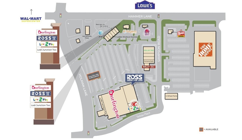 Retail Pad Development in Burlington/Ross Center | Stockton, CA Retail pad development opportunity at Hammer Crossings available for lease in Stockton, California. Space flexible for ±2,000 - 14,075 SF of retail space with the ability for drive-thru. The location is strategically placed in the retail hub of northeast Stockton and benefits from large traffic counts & neighboring tenants like Walmart, Lowe's, Home Depot, and the Stockton Auto Mall.