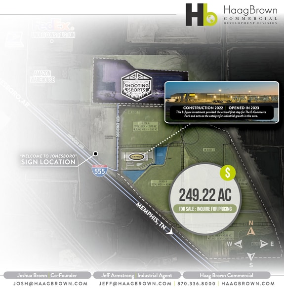 Haag Brown Industrial is excited to present the opportunity to purchase over 200 acres at Jonesboro’s new E-Commerce Park, Northeast Arkansas’ first ultramodern logistics, warehousing, and digital fulfillment park, strategically situated at the gateway of Jonesboro. With over 3,300 feet of frontage on Interstate 555, the project offers global accessibility, being within one day’s drive of 70% of all major U.S. markets. Not only that, but it sits within one hour’s drive from Memphis, Tennessee, the nation’s primary distribution hub, and Mississippi County, Arkansas, the #1 steel producer in America. This makes the location ideal for businesses in logistics, manufacturing, and e-commerce. The park is designed for flexibility, catering to a wide range of industries, from large-scale distribution centers to smaller digital fulfillment operations. The sites are zoned for industrial use and offer the potential for tailored build-to-suit solutions. This makes it an excellent option for companies looking to expand or establish a presence in the region. The infrastructure is already in place, including access to utilities such as water, sewer, natural gas, and electricity, streamlining the development process for prospective buyers. Additionally, the park is not located within the newly re-configured floodplain, ensuring the sites are safe, secure, and buildable without the complications associated with flood-prone areas. This prime location offers unparalleled accessibility and visibility for businesses seeking a dynamic workspace. The available property surrounds Hytrol’s brand new 150,000-square-foot distribution warehouse and sits just down the road from Amazon’s new last-mile facility, placing these sites at the heart of Jonesboro’s rapidly growing industrial and e-commerce ecosystem. With close proximity to critical transportation networks and major interstate corridors, along with established infrastructure, E-Commerce Park is primed to support companies that rely on speed, efficiency, and global connectivity. This is an outstanding opportunity for businesses looking to take advantage of one of the region’s most strategic and accessible locations.