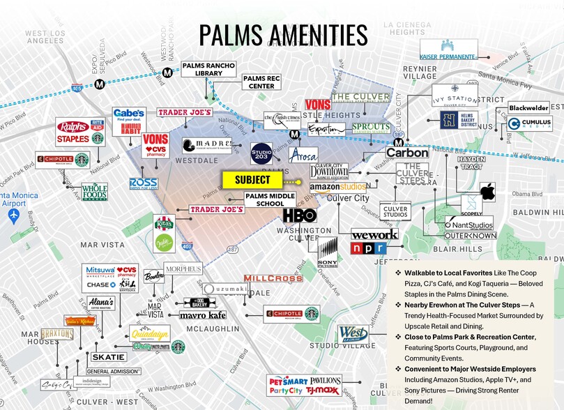 benefits from strong rental demand driven by young professionals, families, and proximity to attractions like the Culver City Promenade. Palms offers a