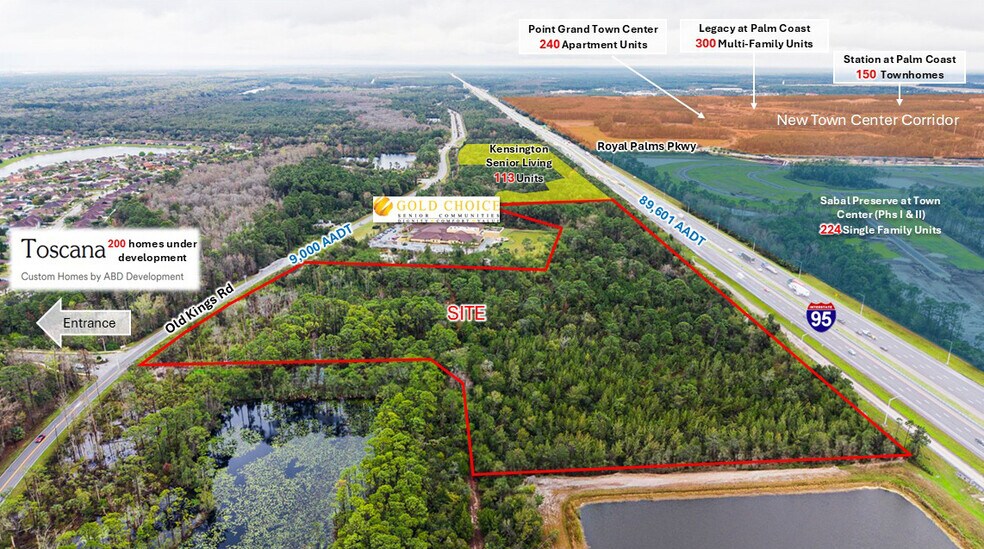 Self-Storage development opportunity in Palm Coast, FL, part of the Daytona Florida MSA. This approved development site includes 23.3 +/- acres along I-95 with 1,497 feet of visibility from 89,601 cars per day with direct access from Old Kings Rd. Across the street from the site is the new Toscana community, where 200 single family homes sites are under construction. Adjacent to the site is an existing Gold Choice Senior Living Community and the recently approved Kensington Senior Living Community with 113 units. Located in a rapidly growing sector of Palm Coast, there is a significant amount of multi- and single-family housing in various stages of planning and construction within the immediate market (maps pg 12). In proximity is the Palm Coast Town Center with projects underway like the Promenade which includes a mix of restaurants, businesses, education centers and apartments complexes, scheduled to finish in 2026.