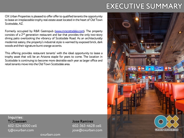 OX Urban Properties is pleased to offer offer to qualified tenants the opportunity to lease an irreplaceable trophy real estate asset located in the heart of Old TownScottsdale, AZ. Formerly occupied by R&R Gastropub (www.rnrscottsdale.com). The property consists of a 2nd generation restaurant and bar that provides the only two-story dining patio overlooking the vibrancy of Scottsdale Road. As an architecturally modernist eatery, the property’s industrial style is warmed by exposed brick, dark woods and their signature burnt orange accents. This offering provides restaurant tenants’ with the ideal opportunity to lease a trophy asset that will be an Arizona staple for years to come. The location in Scottsdale is continuing to become more desirable each year as larger office and retail tenants move into the Old Town Scottsdale area.