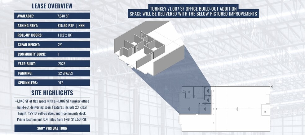 ±7,840 SF of flex space with a ±1,007 SF turnkey office build-out delivering soon. Features include 23’ clear height, 12’x10’ roll-up door, and 1 community dock. Prime location just 0.4 miles from I-49. $15.50 PSF. Virtual tour: https://my.matterport.com/show/?m=HMPaxTxDt1u