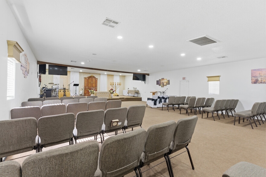 stage (currently the youth hall) 2 bathrooms, Women's has three stalls and men's has one, full kitchen with commercial stove and vent