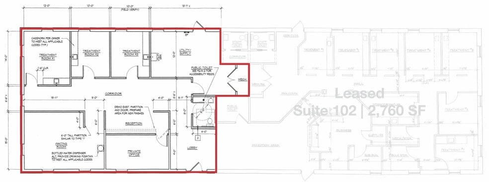 - Interior includes reception, private office, ADA restroom, and treatment rooms.