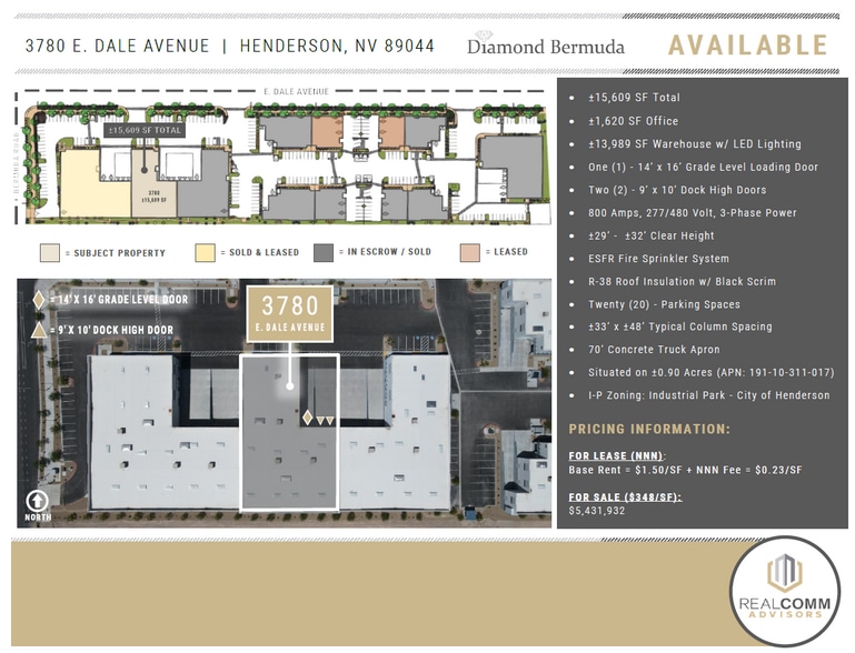 Diamond Bermuda Industrial Center is a Twelve (12) Building Institutional Quality, Concrete Tilt-Up Industrial Project Totaling ±128,680 Square Feet. Situated in the Heart of West Henderson, Diamond Bermuda Industrial Center is Located at the Southeast Corner of Dale Avenue & Bermuda Road, just North of Volunteer Boulevard & West of Raiders Way. The St. Rose & I-15 Freeway Interchange is Located within 1.6 Miles, and the Location Offers Close Proximity to an Abundance of Amenities & Services.